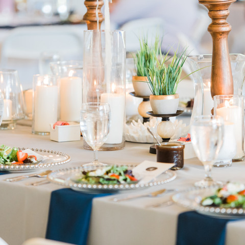 Pops of blue and gold along with candles for days, wooden accents and greenery created a luxurious and warm feeling for the reception.